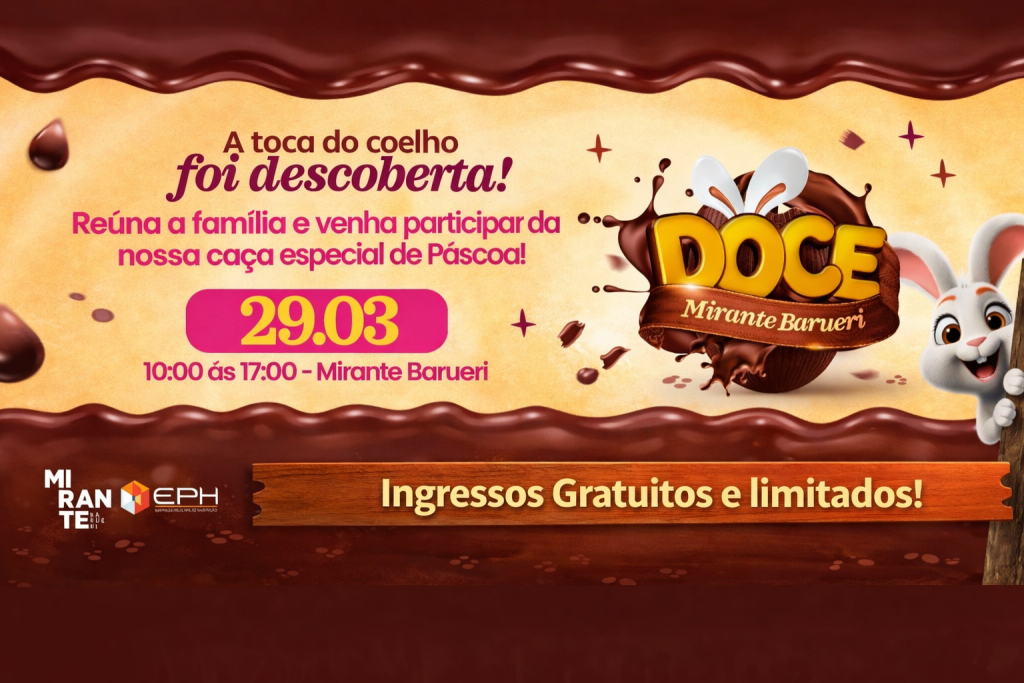 No dia 29 de março, o Mirante Barueri recebe o Doce Mirante, um evento pensado para famílias que querem sair da rotina e viver uma experiência leve, divertida e organizada, com direito a muitas atividades para deixar o dia da criançada ainda mais especial.